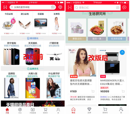 天猫App改版前后首页卡片对比
