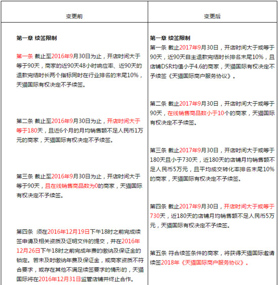 具体来看,天猫国际将对商家不予续签的规则有3个调整和2个新增的条款: