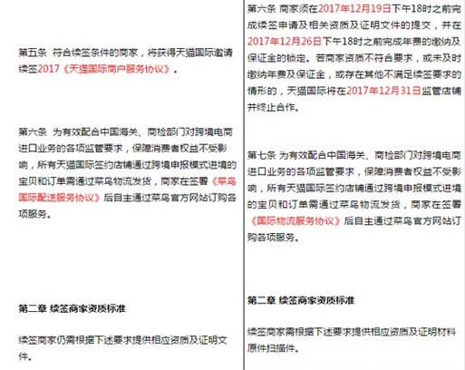 调整三:根据旧的规则,开店时间大于等于180天家,且近6个月的月均销售额不足人民币1万元的商家,天猫国际有权决定不予续签。规则升级后,这一条款变为“开店时间大于或等于180天且小于730天,近180天的店铺月均销售额不足人民币5万元,且平均成交转化率排名末尾10%的商家,天猫国际有权决定不予续签。”