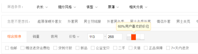 第一种方法就是借助淘宝的价格区间划分,在搜索栏中找到自己同类目同款宝贝受众人群最多的价格区间去选择定价,这样的定价方式方便快捷,且容易找到买家的心理价位。