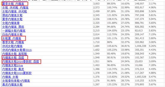 如果你是一个C店,你看红框里面的这个词:女鞋春季新款2016内增高,99.94%都被商城点走了,这个词再好,也是不适合你的,0.06%得机会,哪有那么容易就是你的。