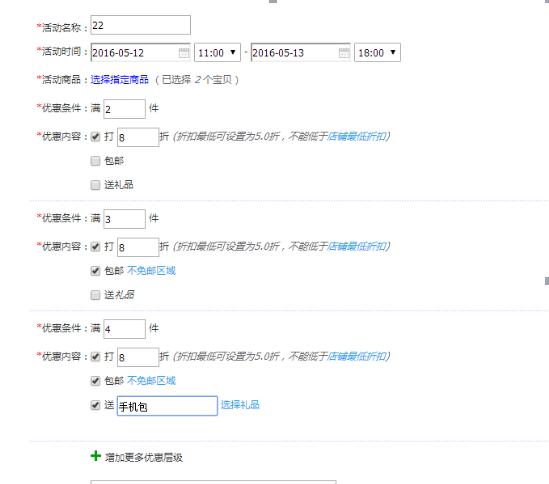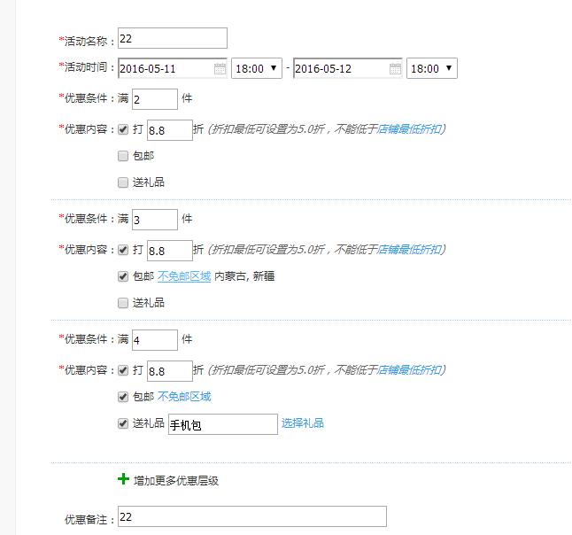 如上图设置好,点击保存就可以了,和全店的活动是一样的,我们可以设置普通优惠,也可以设置多层级优惠,具体的采取哪种形式的优惠方式,单品的活动力度去设置就ok了