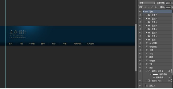 然后加上导航条(通常导航条就是我们整个页面的主色调了,所以这个不能乱来哟)。我们先画出一个比底色深的蓝,有一种厚度下沉的感觉,然后再复制一份坐下模糊效果更融合一些。分类字体之间的竖条是通过一个深色一个浅色竖条叠加出来的向下凹的感觉。