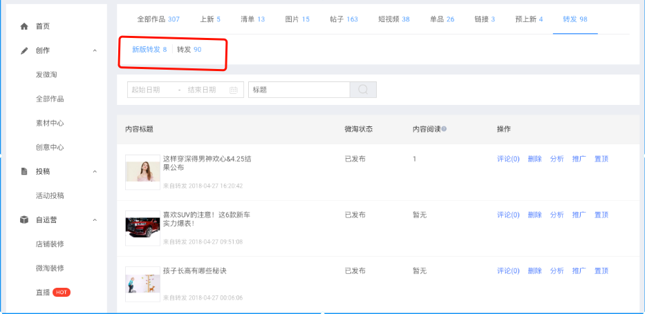 转发之后内容可以在左侧栏“全部作品-转发”中进行管理,有“新版转发”和“转发”两种。“新版转发”即此次上线后商家发布的所有转发内容都可在该栏下找到。“转发”为旧版本下的转发内容,包括阿里创作平台旧版下的转发和手淘上的转发操作。为方便商家内容管理,新旧迭代期内,两个版本下的转发内容都会在内容管理下进行呈现,直到手淘发布端转发产品迭代上线,会将“转发”下线,只保留“新版转发”。