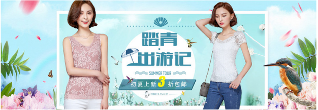 主题型海报就比较常见了,营造出来的氛围容易让消费者产生共鸣。例如我们的主题是盛夏,那么从主题中可以联想到的是蓝天、夏天、绿叶、花草、清凉、出游等意境,只要确定了元素,那么我们的场景就是蓝天白云,元素为花草。